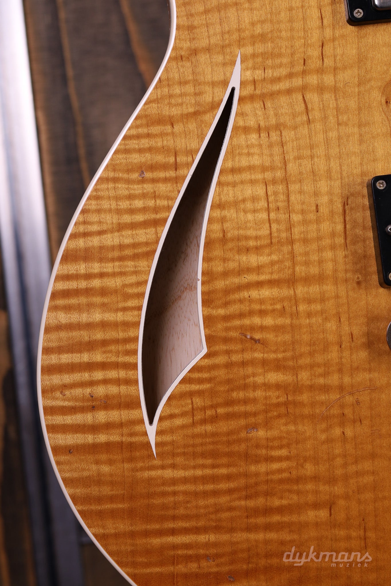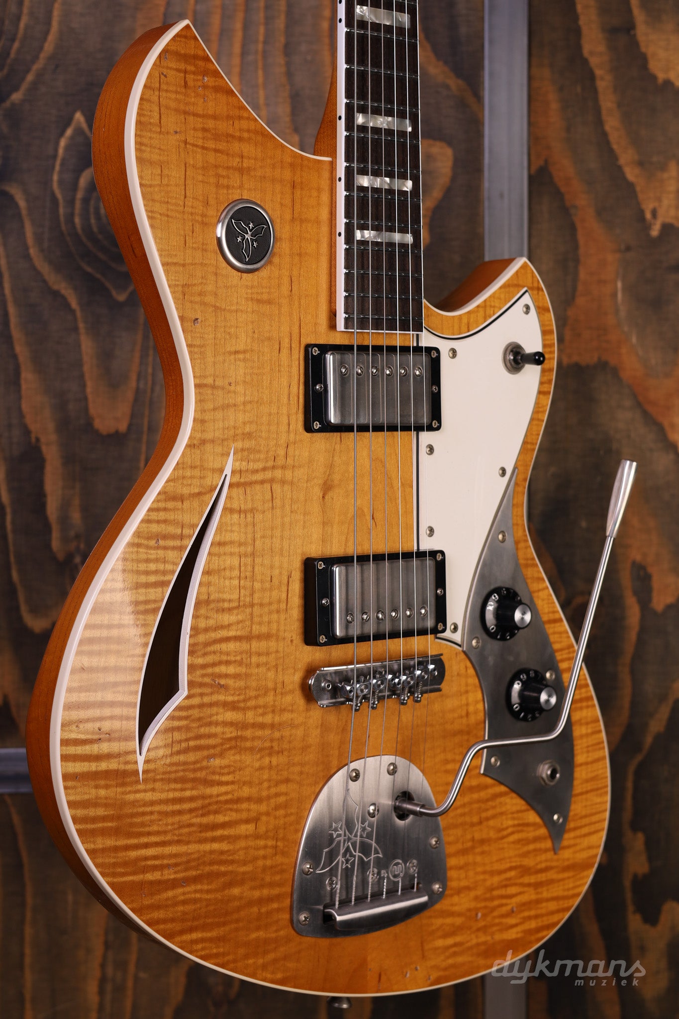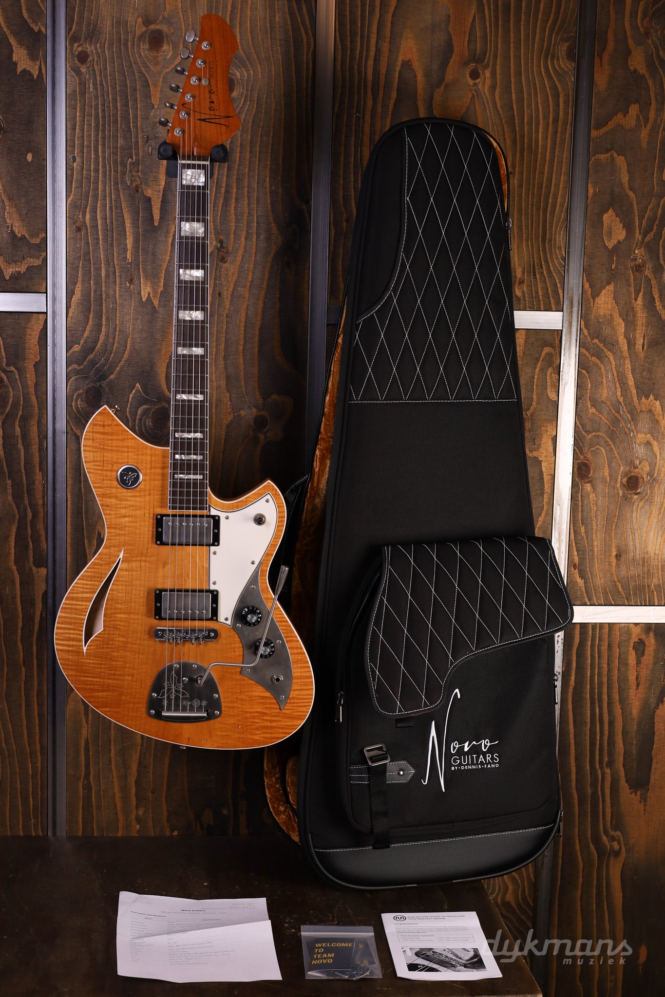 De Novo Miris J in Amber Burst combineert ambachtelijke kwaliteit met een uitgesproken, boutique-geïnspireerde uitstraling. Deze semi-hollow elektrische gitaar heeft een zorgvuldig uitgevoerde Swamp Ash-body met amberkleurige afwerking en lichte distressing, wat zowel visuele diepte als een warme resonantie geeft — een instrument dat er net zo indrukwekkend uitziet als het klinkt.