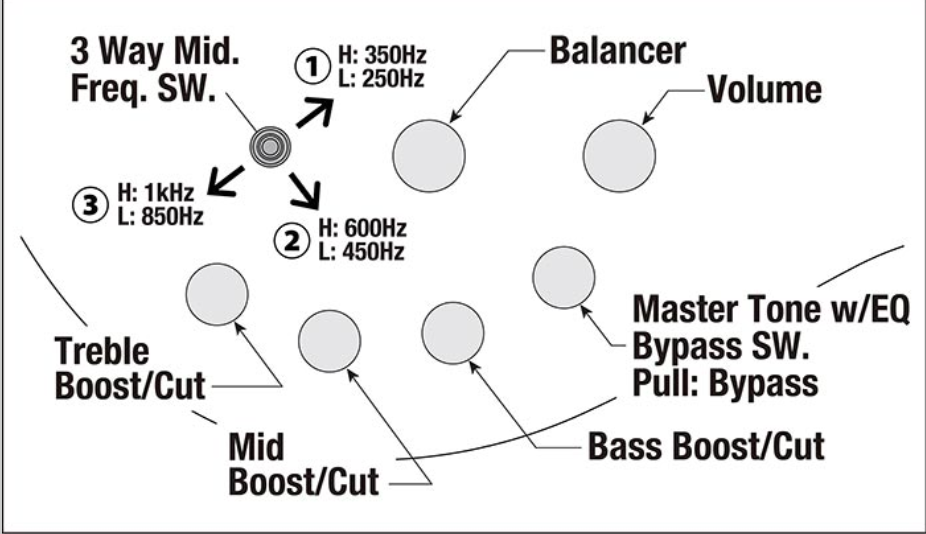 Ibanez Sonitech Preamp 3-Band-EQ mit EQ-Bypass-Schalter (Push/Pull), 3-Wege-Mittelfrequenzschalter mit Hexa-Mid-System