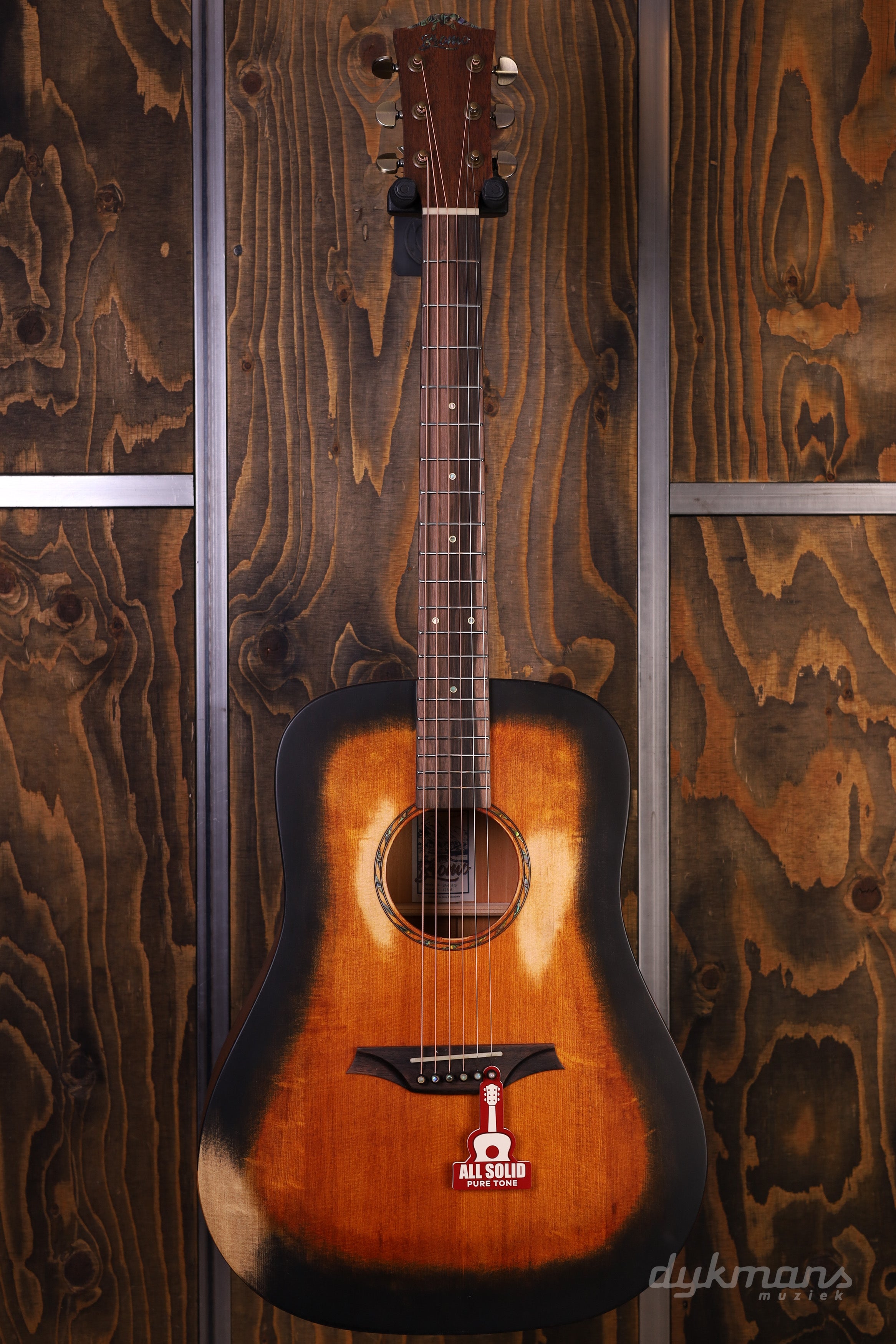 De hals is verstevigd met ebbenhouten strips en heeft een amara ebbenhouten toets voor extra speelgemak. De gitaar heeft een warme "historic sunburst" satijnen afwerking en is voorzien van abalone "eagle eye" inleg en een abalone "cowboy rope" rozet